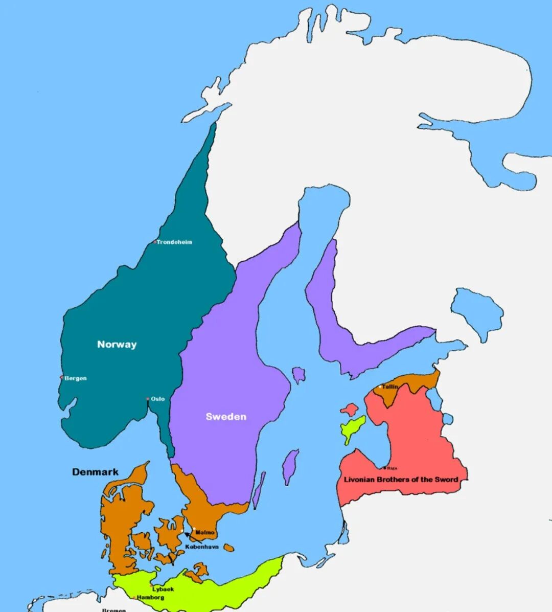 而在丹麦,反倒在12至13世纪拥有一段相对统一的时期,因此得以用其称霸海洋的传统,把波美拉尼亚(今德国及波兰北部)和爱沙尼亚纳入其统治之下。虽然王位没有太大争端,但国王却与贵族与教会关系恶劣,王权、教权及地方权力之间的拉扯,最终在13世纪末导致王权没落。