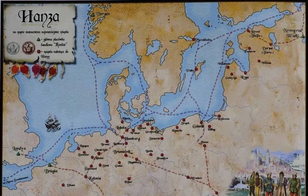 12-13世纪中欧的神圣罗马帝国与条顿骑士团诸城市之间形成了商业、政治联盟汉萨同盟,以德意志北部城市为主。汉萨一词,德文意为“商会”或者“会馆”,最早是指从须德海到芬兰、瑞典到挪威的一群商人与一群贸易船只。宗旨从镇压海盗、打击掠夺行为和取消不合理的通行税等保护商业的行为转至在海外扩展商业势力,垄断商业利益,压制来自同盟外的城市。14世纪晚期—15世纪早期达到鼎盛,加盟城市最多达到160个。