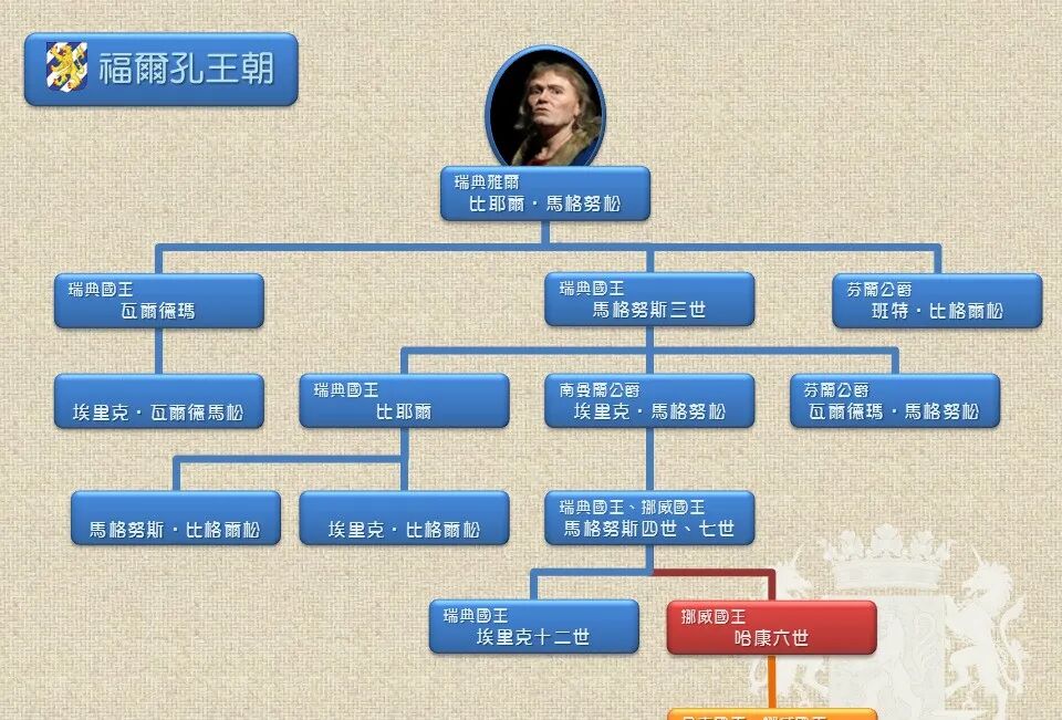 至于瑞典,也同样处于数个家族争夺王位的时期。1125 年,瑞典国王小英格逝世,丹麦王室阿斯特里德松家族的马格努斯一世和斯渥克尔一世一同称王。虽然马格努斯在1134年的内战中战死,但斯渥克尔却未能巩固家族的权力。他在1156年被刺杀以后,另一家族的埃里克获贵族选为艾里克九世,斯渥克尔家族和艾里克家族长期的权力斗争和王位继承权之争由此开始。1250年,在斯渥克尔和艾里克两个家族都绝嗣后,比耶博家族的瓦尔德玛凭借与两个家族都有血缘关系,获选为瑞典国王,才把国家重新统一。