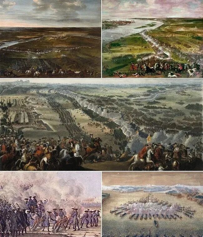 大北方战争:从上开始顺时针方向:纳尔瓦之役、迪纳会战、波尔塔瓦会战、甘古特会战、加德布施会战