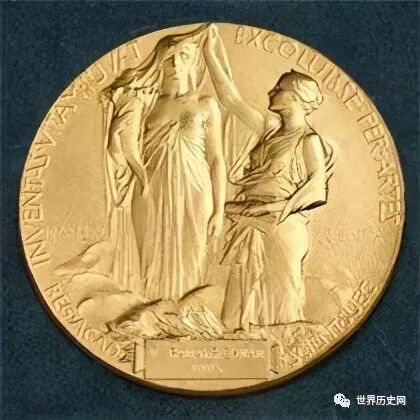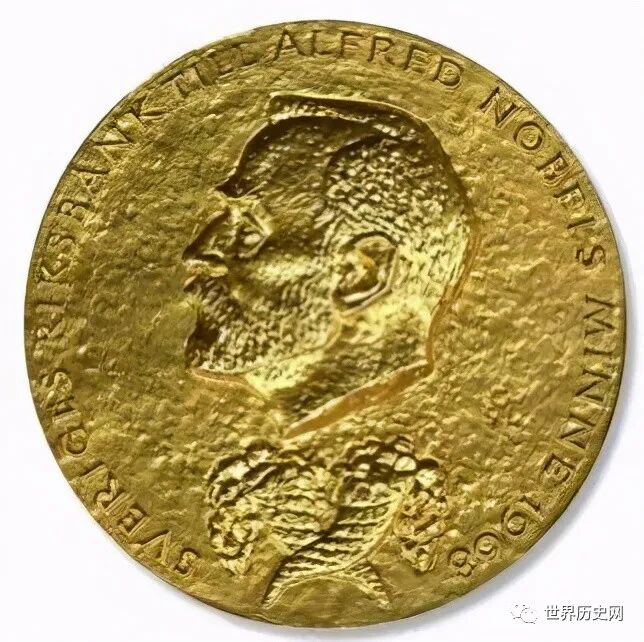 奖章上的诺贝尔西装革履,一旁还刻有他的名字以及生卒年份。