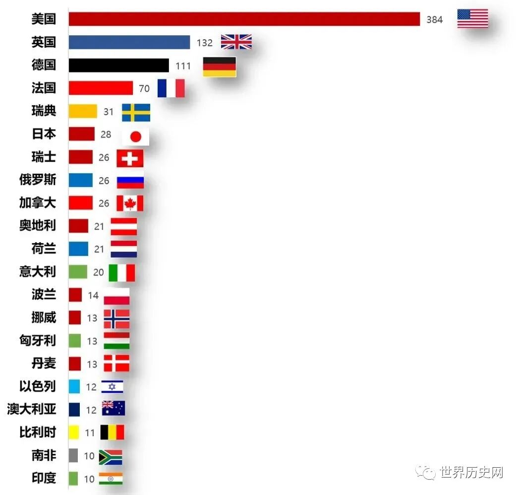 1901-2020年诺贝尔奖获得者国家分布