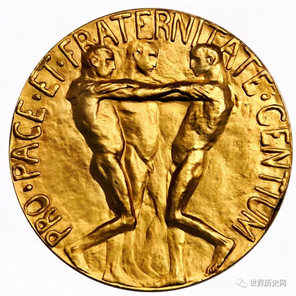 诺贝尔和平奖奖章背面的图案是三位男士手牵手、肩并肩的图案则,用兄弟情谊象征和平。