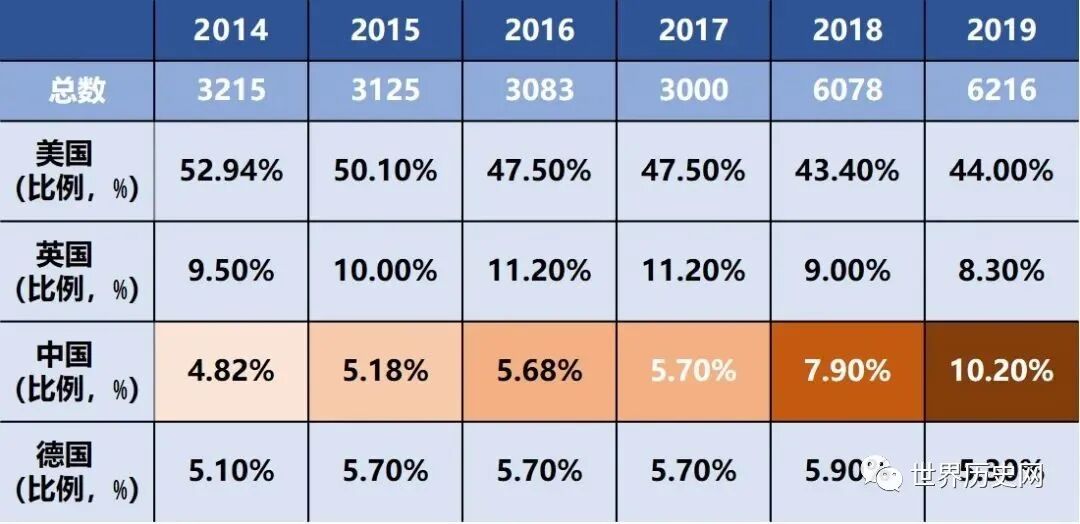 科睿唯安过去6年全球高被引学者数量显示,除了美国高被引科学家一直处于国际遥遥领先地位外(持续保持40%以上的比例)。中国“高被引”科学家的比例正逐年快速增长,已从2014年的近5%上升到2019年的10%,在2019年超过曾经的“老二”英国。