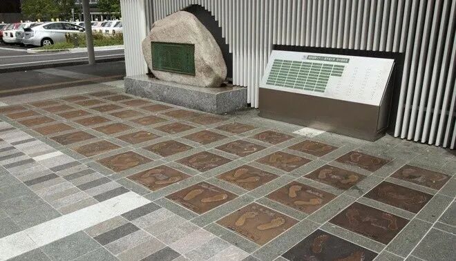 位于博多站的福冈马拉松纪念碑,以及过去优胜者的脚印