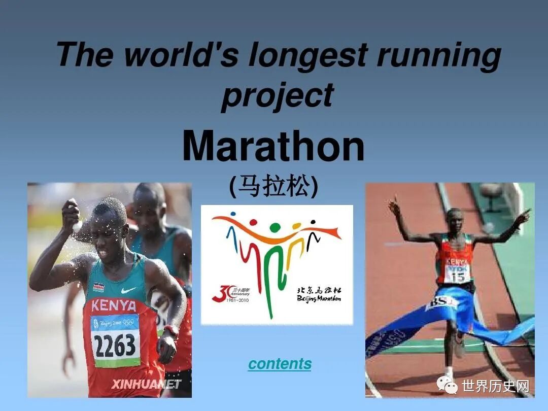 马拉松在1896年的第一届奥运会上成为正式项目,但是在公元前776年到公元后261年的这一段时间内,古代奥林匹克中从没有马拉松这个项目,当时最长的距离也少于5公里。到了现在,马拉松已经成为了现代奥运会中的中心环节,它也在世界各地广为举办,完全是出于人们对马拉松的痴迷。
