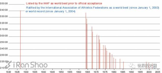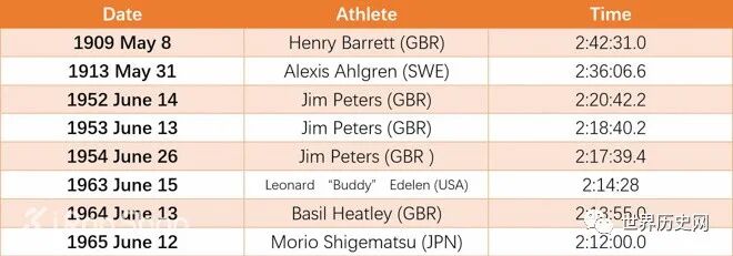 1963年,巴迪艾德伦(Buddy Edelen)跑出了2:14:28,成为了世界上首个跑进215的人,巴兹尔希特利(Basil Heatley)不甘示弱,在1964年跑进了214,成绩为2:13:55,1965年日本选手重松森雄(Morio Shigematsu)将世界记录提高到了2:12:00。