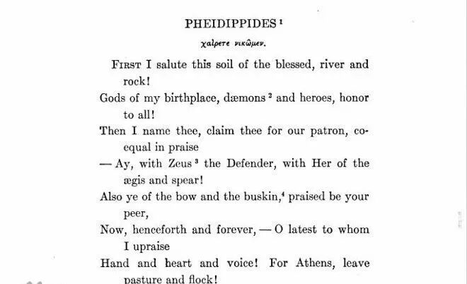 罗伯特·布朗宁(Robert Browning)将菲迪皮德斯从马拉松跑到雅典的死亡之旅写成了的诗歌,这也解释了当时皮埃尔德·顾拜旦(Pierre de Coubertin)男爵试图让奥运会回归现代的原因。