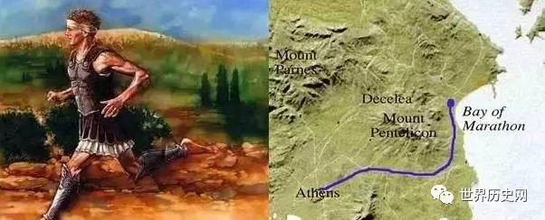 希腊波斯战争(公元前492-前449年)中,公元前490年,波斯王大流士一世渡海西侵,进击阿蒂卡,在距雅典城东北的马拉松海湾登陆。雅典军奋勇应战,在马拉松平原打败波斯军队。史称马拉松之战。为了把胜利消息迅速告诉雅典人,希腊派遣长跑优胜者菲迪皮得斯(Pheidippides)从马拉松跑至雅典中央广场(全程42公里195米)。在极速完成26.2英里的路程并传达胜利的消息后,体力衰竭倒地而亡。而其奇迹光荣的功绩而成为希腊的民族英雄。