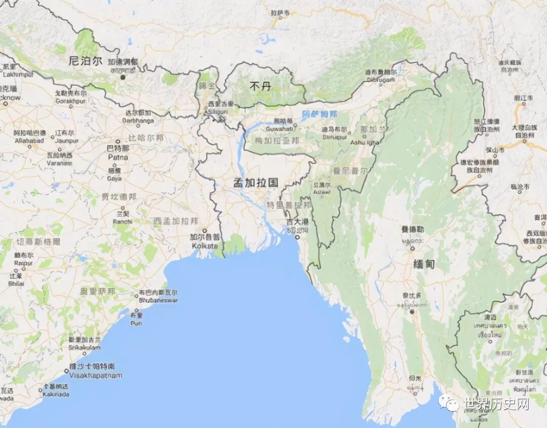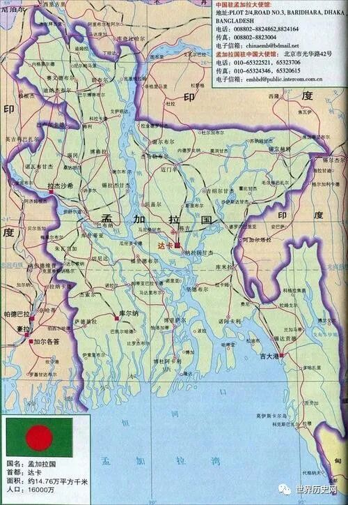 孟加拉国南方毗邻孟加拉湾,在陆地上三面被印度包围,仅东南一小部与缅甸接壤。孟加拉国只有50多年的建国史,建国前,这片土地叫东巴基斯坦。