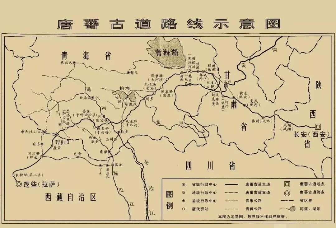 今天的学者给了唐蕃古道这样的线路走向:起点是唐王朝的国都长安(今陕西西安),终点是吐蕃都城逻些(今西藏拉萨),跨越今陕西、甘肃、青海、四川和西藏5个省区,全长约3000公里,其中一半以上路段在青海境内。它的大致路线是,从长安沿渭水北岸越过陕甘两省界山──陇山到达秦州(今甘肃天水),溯渭水继续西上越鸟鼠山到临州(甘肃临洮)。从临洮西北行,经河州(甘肃临夏)渡黄河进入青海境内,再经龙支城(青海民和柴沟北古城)境内西北行到鄯州(青海乐都)。以上可以称古道东段,全在唐王朝境内。