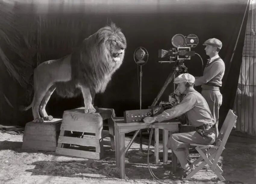 观看电影时,我们看见的那只咆哮的狮子是米高梅著名的标志。事实上,有许多狮子都被用过做米高梅的标志。照片中的这只狮子名字叫杰基,为了拍摄狮子的吼声,工作人员专门围绕杰基搭建了一个录音台,只不过录音时这两个工作人员和它一起被关在笼子里,不知道这两人和野生的努比亚狮子关在一起工作的感觉如何。