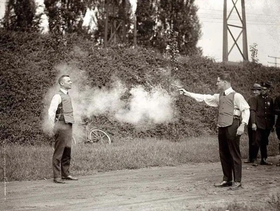 过去的人们做的测试都是真枪实弹的演练!这是英国发明家沃伦对自己发明的保护性飞行头盔的安全演示。在当时,头部受伤是飞行事故中飞行员死亡的主要原因,因此他发明了一种皮革覆盖、装有弹簧的飞行员安全头盔。头盔是安全了,不过测试方法并不安全呀!