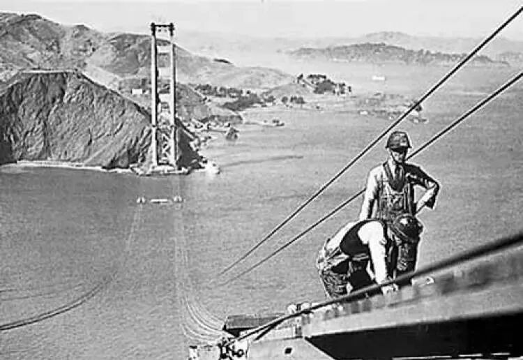 建设金门大桥是一个浩大而又艰巨的工程。相片中,桥已经建了一半。施工人员在水面上挂起了一张特殊的安全网,以便在工人滑倒时能抓住他们。1935年,也就是这张照片拍摄的那一年,这张网足足挽救了19条生命。