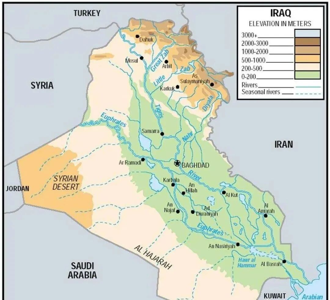 伊拉克位于亚洲西南部,阿拉伯半岛东北部,北接土耳其,东邻伊朗,西毗叙利亚、约旦,南连沙特阿拉伯、科威特,东南濒波斯湾,海岸线长度为58公里。伊拉克所在的地区在历史上曾被称为美索不达米亚,是人类文明的主要发源地之一。
