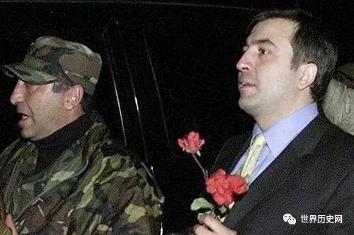 2003年,格鲁吉亚发生了颜色革命,也就是“玫瑰革命”,在加入北约问题上摇摆不定的谢瓦尔德纳泽被赶下台。取而代之的是街头政治——表演艺术家萨卡什维利上台,并在2004年当选格鲁吉亚总统,当时的萨卡什维利36岁。