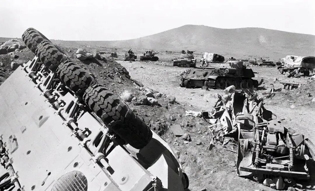 上图_ 第四次中东战争,被以色列空军狂轰滥炸后的埃及装甲部队和运输机