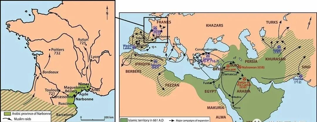 向北侵入高卢。在波瓦都战役中,遭到法兰克王国宫相查理马特抵抗。入侵西欧的势头被阻止。