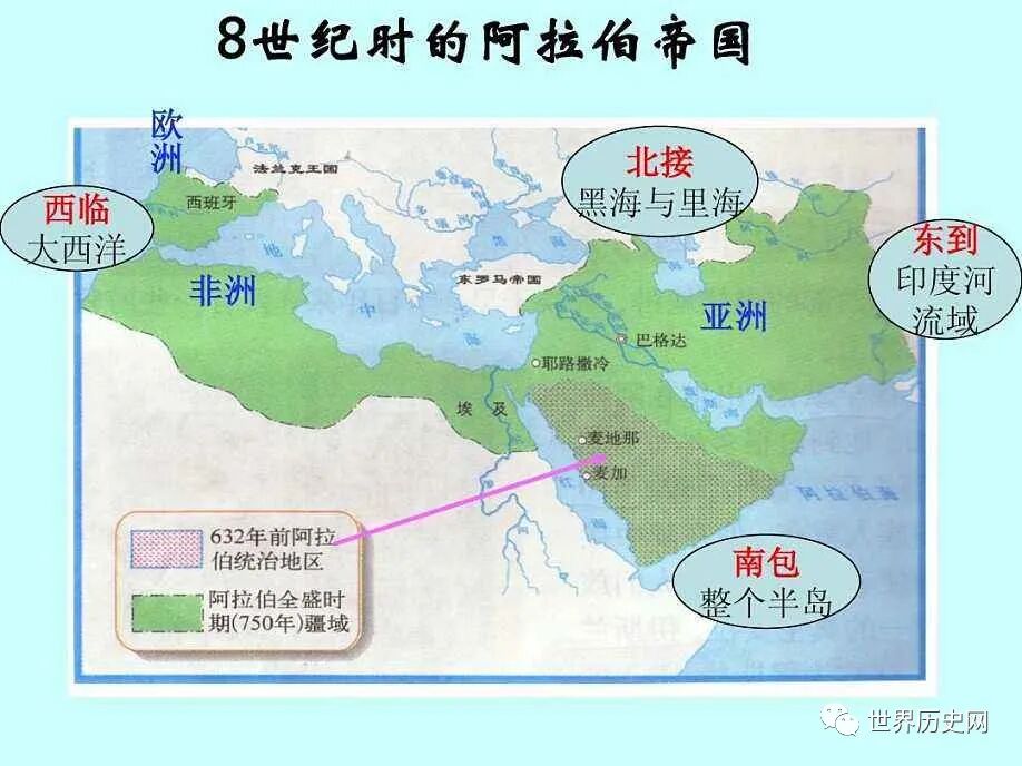 到八世纪初,阿拉伯帝国势力达到了鼎盛期,其疆域东起印度河流域,西临大西洋,成为一个横跨亚非欧三洲的大帝国。中国史书将其称为大食帝国。