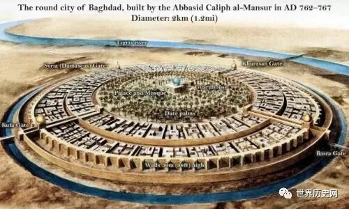 每个圆环之间都是密密麻麻的建筑,最中心的建筑是哈里发宫殿。这个城市是当时最高统治者曼苏尔亲自设计的,完全按照几何学精确规划出的。曼苏尔是欧几里得的粉丝,他用自己圆形的首都向几何学大师欧几里得致敬。这是一座精密计算出的城市,只有可靠的数学体系才能完成。