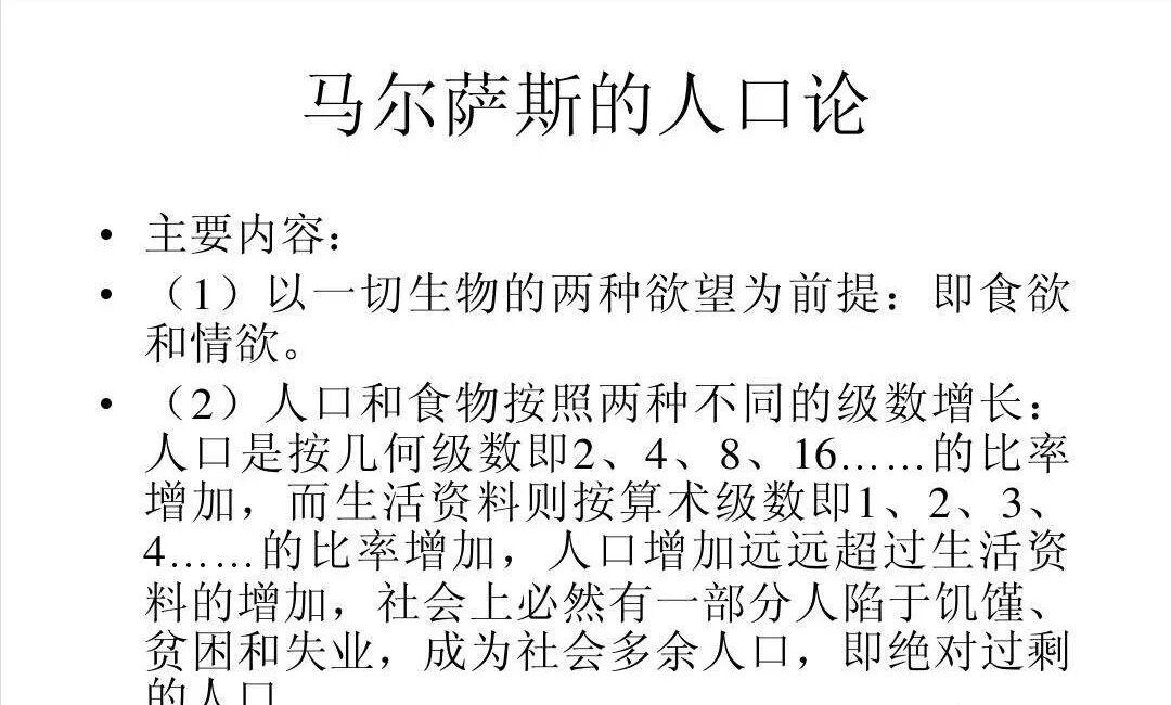 “人口是按几何级数增加的,而生活资料只能按算术级数增加。对食物产地的压迫、饥饿和无法控制的欧洲人和海外人将把一切都吃得精光。”