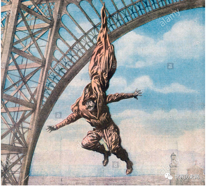 弗朗兹·里歇尔(Franz Reichelt)是一位奥地利裁缝,创造了一种奇怪的大衣和降落伞混合体,他声称这个发明可以使穿戴者轻柔地滑到地面甚至飞行。他在艾菲尔铁塔的最顶层进行了实验,然后在一群观众和一个摄制组的面前,坠落下来,摔得粉碎。