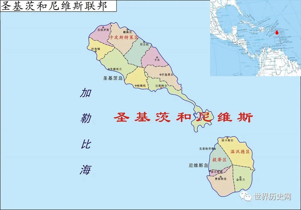 圣基茨和基维斯全名圣基茨和尼维斯联邦,面积267平方公里,由两个小岛构成,人口不足6万,是加勒比海地区的一个小国,也是美洲地区面积最小的国家。