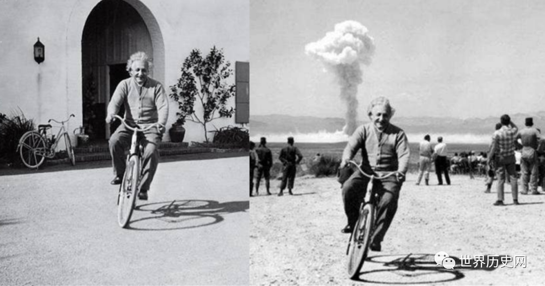 那张搞笑的图片,爱因斯坦骑着自行车在原子弹试爆现场调皮,是后世网友们PS的。