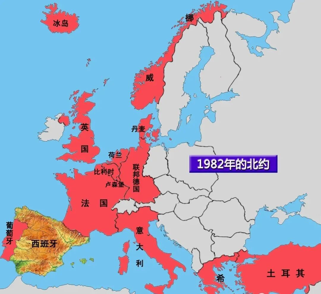 因为佛朗哥的军事独裁统治和其二战期间与德意法西斯的暧昧状态,使得战后的西班牙遭到国际社会普遍排斥。联合国资格被取消,北约等各类国际组织机构亦对其紧闭大门……。1975年佛朗哥去世后,登基的胡安·卡洛斯一世实行君主立宪制,逐渐获得西欧国家认可,北约随即对其敞开怀抱。此轮扩张对加强北约的南翼有重要影响,因为北约认为其南翼地区,即北非的马格里布存在着民族和宗教方面的不稳定因素。