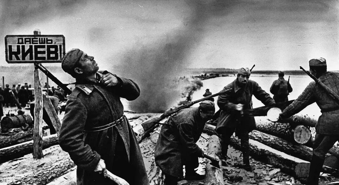 苏军士兵正准备小木排渡过第聂伯河(标语上写道你将会把基辅交给我们)
