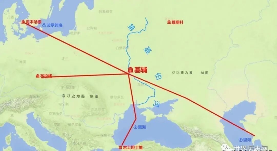 一条是水路,第聂伯河贯穿南北,把北方的波罗的海和南方的黑海连接在了一起;这条路被称为“瓦希商路”,也就是从北方的瓦良格人那里直接可以抵达希腊人所在的君士坦丁堡。