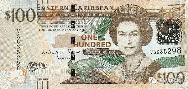 27.多米尼克货币是东加勒比元,而东加勒比元是很多加勒比岛国共用的货币,上边印着女王头像。