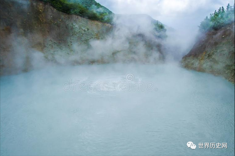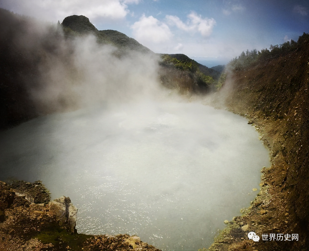 12、多米尼克南部瓦特山附近的山谷中,有一位于海拔700多米处的被称为"沸腾湖"的间歇湖,是世界上数一数二的大型热泉湖,湖面烟雾缭绕,热气腾腾,有时还会形成高达2-3米的水柱,十分壮观,是岛上的一大景观。