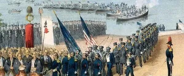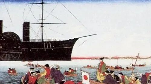 历史的发展总有其必然的趋势,但在发展的过程中,总会有一些关键性的事件来起到推动的作用。1853年7月8日,江户湾浦贺海面上出现了4艘很多日本老百姓从未见过的船。其中2艘大船上面竖立着巨大的风帆,而另外2艘则更奇怪了,它们船身的两侧有着巨大的轮子,轮子缓缓地在水里转动着,船身上还竖立着奇怪的柱子,柱子里还不断冒出浓密的烟雾。所有这4艘船全身都涂成了黑色,船身两侧开着一些洞口,隐约可见里面似乎是一门一门的大炮。日本老百姓们带着一丝恐惧的心理,好奇地看着这些船,船上唯一不是黑色的就是那高悬在桅杆顶端的旗帜,上面满是星星和条纹。