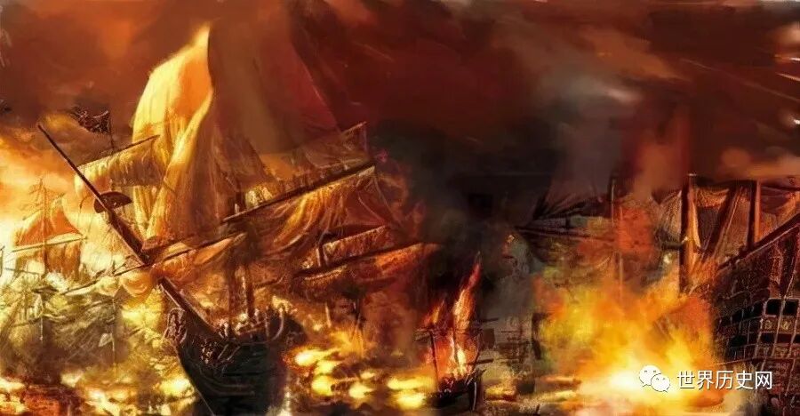 当西班牙舰队到达尼德兰加莱附近时,并未得到计划好的帕尔马公爵的船只人员及弹药的补给。7 月 29 日凌晨,英国在 8 艘旧船内装满硫黄柴草等易燃物品,船身涂满柏油。点燃后,8 只火船像 8 条火龙顺风而下,向西班牙舰队急驰而去。