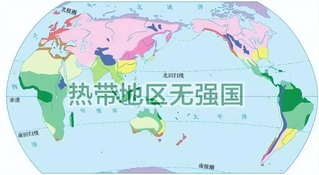 因此,在第二次世界大战结束之前,整个热带地区基本全是殖民地,西方殖民者在这里攫取了无比的财富,所以热带就更不可能出现强国了。