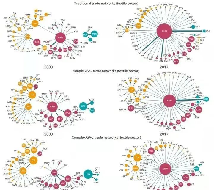 上面这张图来自世界银行,比较清晰地展现了最近20年全球纺织业的变化。2000年,全球纺织业群雄割据;然而到了2017年,中国变得有点像纺织业的那颗太阳,世界上所有产业链都在绕着中国转!