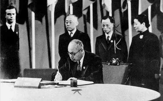 1945年6月在美国旧金山,中国代表第一个在《联合国宪章》的中、法、俄、英、西5种联合国正式语言文件上签字。随后是法、苏、英、美4国代表依次签字,然后才是与会的其他45个国家,后又有波兰补签。中国代表团共8名成员分别在《联合国宪章》上庄重地签上了自己的名字。图为:中国共产党的代表董必武在《联合国宪章》上签字。