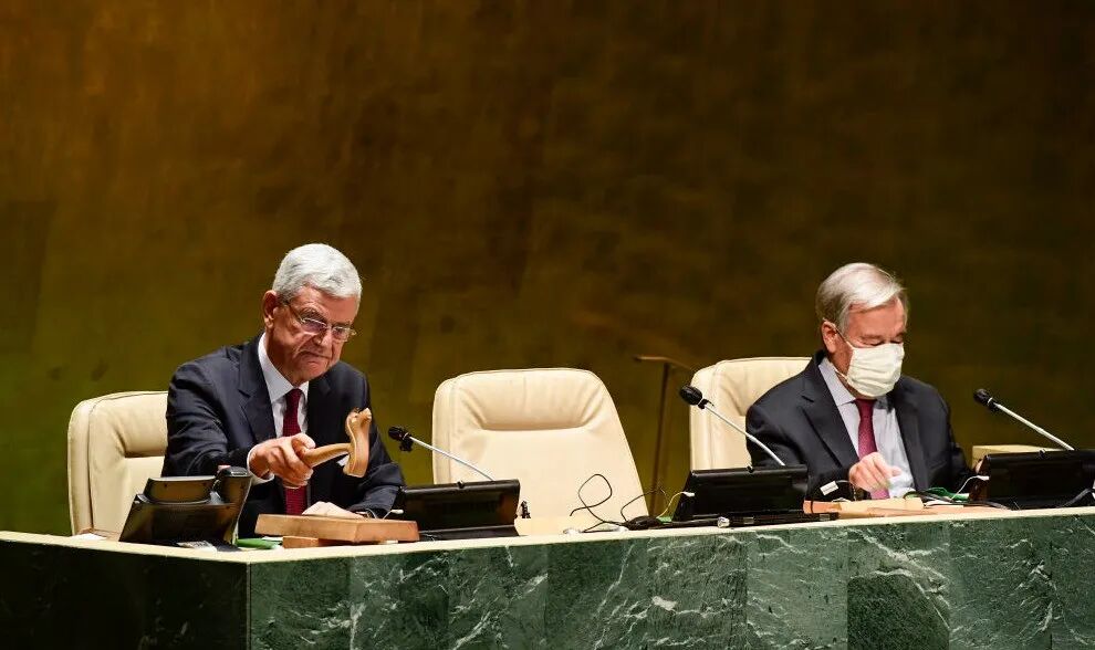 9月15日,在位于纽约的联合国总部,第75届联合国大会主席沃尔坎·博兹克尔(左)宣布第75届联合国大会开幕。联合国秘书长古特雷斯(右)和第75届联大主席沃尔坎·博兹克尔强调,在面临诸多威胁与挑战、尤其是在新冠疫情肆虐全球之际,国际社会更应坚定捍卫多边主义,抵制单边主义,树立对联合国的信心。