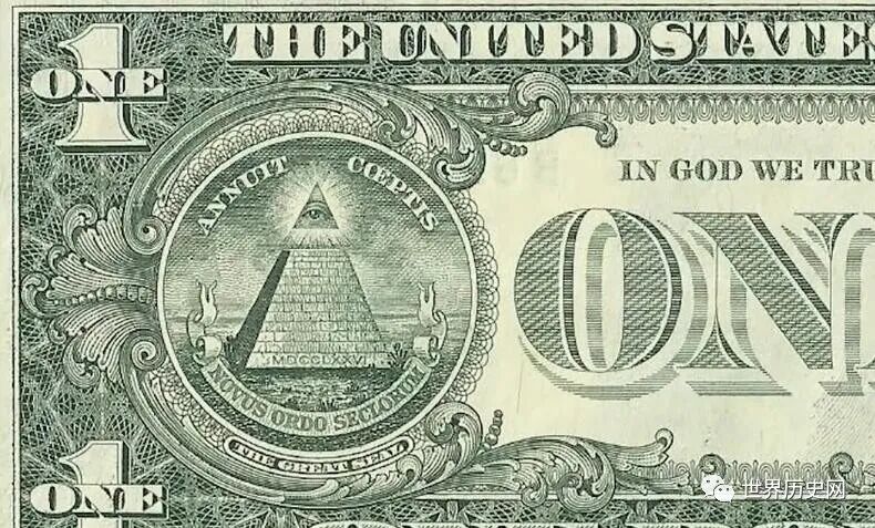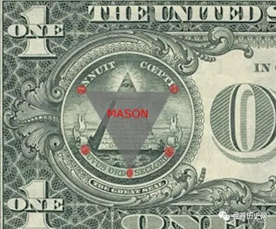 阴谋论者们发现一美元纸币背面有一个上帝之眼的标志,这就象征着共济会,而在金字塔图案的基础上补充出来一个6芒星,其中5个角指向的字母组合起来就是"MASON"石匠的意思,这就说明了美国也在共济会的掌控之中。