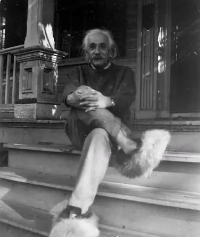 爱因斯坦正坐在自家门前的台阶上,那双毛毛鞋特别显眼,原来科学家也有童心未泯的喜好。