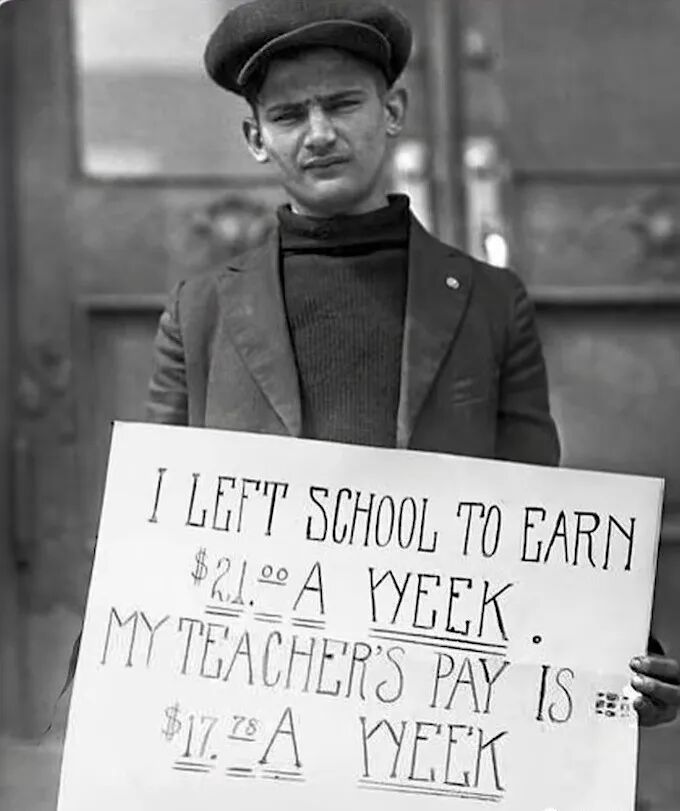 这位辍学少年写道:我离开学校每周可以赚到21美元,而我的老师每周的工资只有17.78美元。少年正在为老师的微薄收入而忿忿不平,一个价值不被认可的年代。
