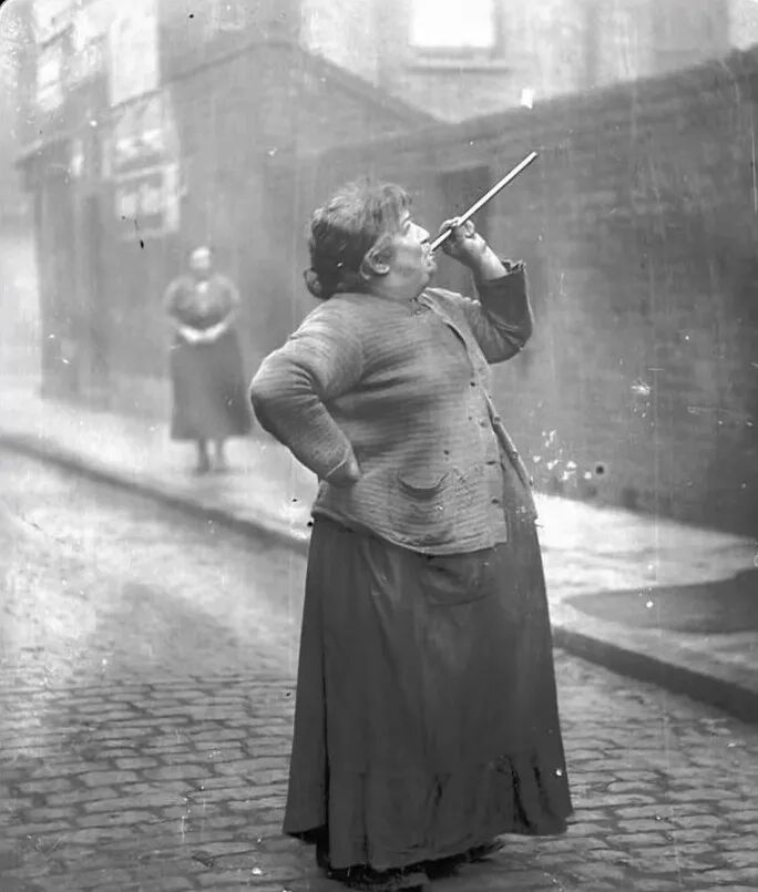 其实这是她的职业:叫早人。她是被雇佣专门给工人叫早的。叫早的方法就是从管子里往门窗上吹豆子,利用豆子撞击门窗玻璃的噪音而把工人吵醒。