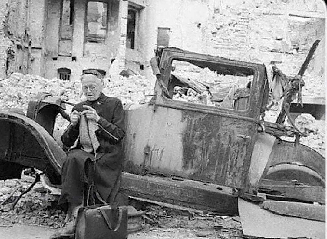 这位老人坐在废墟上安详地织着毛活,1945年的9月,二战终于结束了,不管是在哪里,人们终于可以无忧无虑地做自己想做的事了。