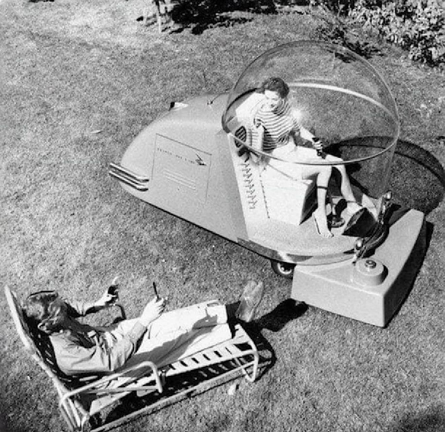 这是一台带有空调的割草机,优雅的女士穿着裙子和高跟鞋也能操作,舒服凉快而又好玩。