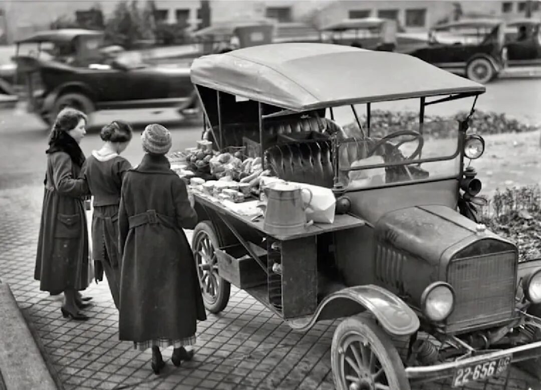 在那个年代拥有一款福特的私家车有多么的不容易,用昂贵的私家车来开个街头的三明治小店,太有创意了!瞧,吸引了不少美女!有点怀疑店主开店的动机。