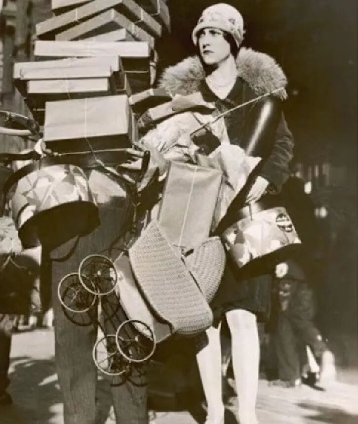 这位优雅的女士和她的佣人,一位妥妥的购物狂,那时还不存在疯狂打折和“黑色星期五”。