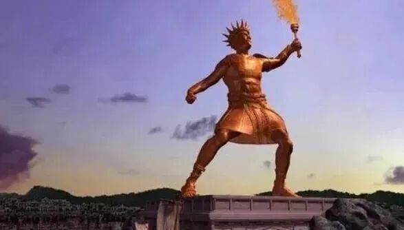 罗德岛太阳神巨像,它是希腊太阳神赫利俄斯的青铜铸像,高约33米。巨像铸造完工后过了56年,毁于公元前226年的一次地震中。