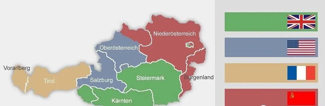 奥地利是个悲催的国家,1945年,二战结束后,德国战败,奥地利脱离德国,被美、苏、英、法四国分区占领。