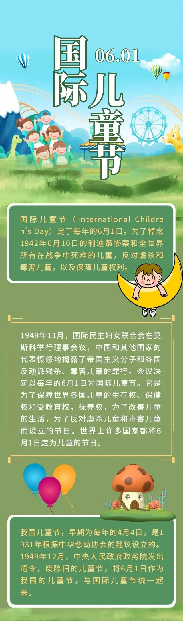 在这种大环境下,1949年十一月,为了悼念利迪策惨案和全世界所有在战争中四年的儿童,反对虐杀和毒害儿童以及保障儿童的权利,国际民主妇女联合会在莫斯科举行的理事会上在多数国家的赞同下决定以每年的六月一号作为国际儿童节,继而希望能够保障世界各国儿童的生存权、保健权和受教育权,使儿童的生活得到改善。这就是六一儿童节的来历。